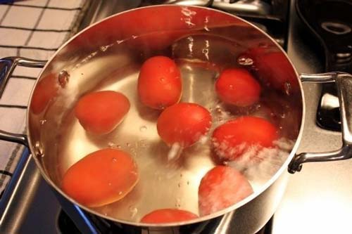 - sau khi luộc chín thì bóc vỏ bên ngoài cả chua bỏ và bất và xay nhuyễn, hạt cà chua có thể bỏ.